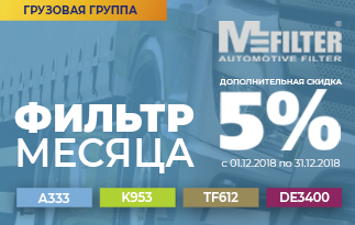 Акция "Фильтр месяца" для грузовой группы Posted on : 06-11-2018 17:57 С 01.11.2018 по 30.11.2018 действует акционное предложение на все типы фильтров для грузовой группы.